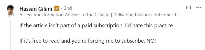 → As a reader: it’s a small nuisance but I’ll subscribe if the article seems worth reading.